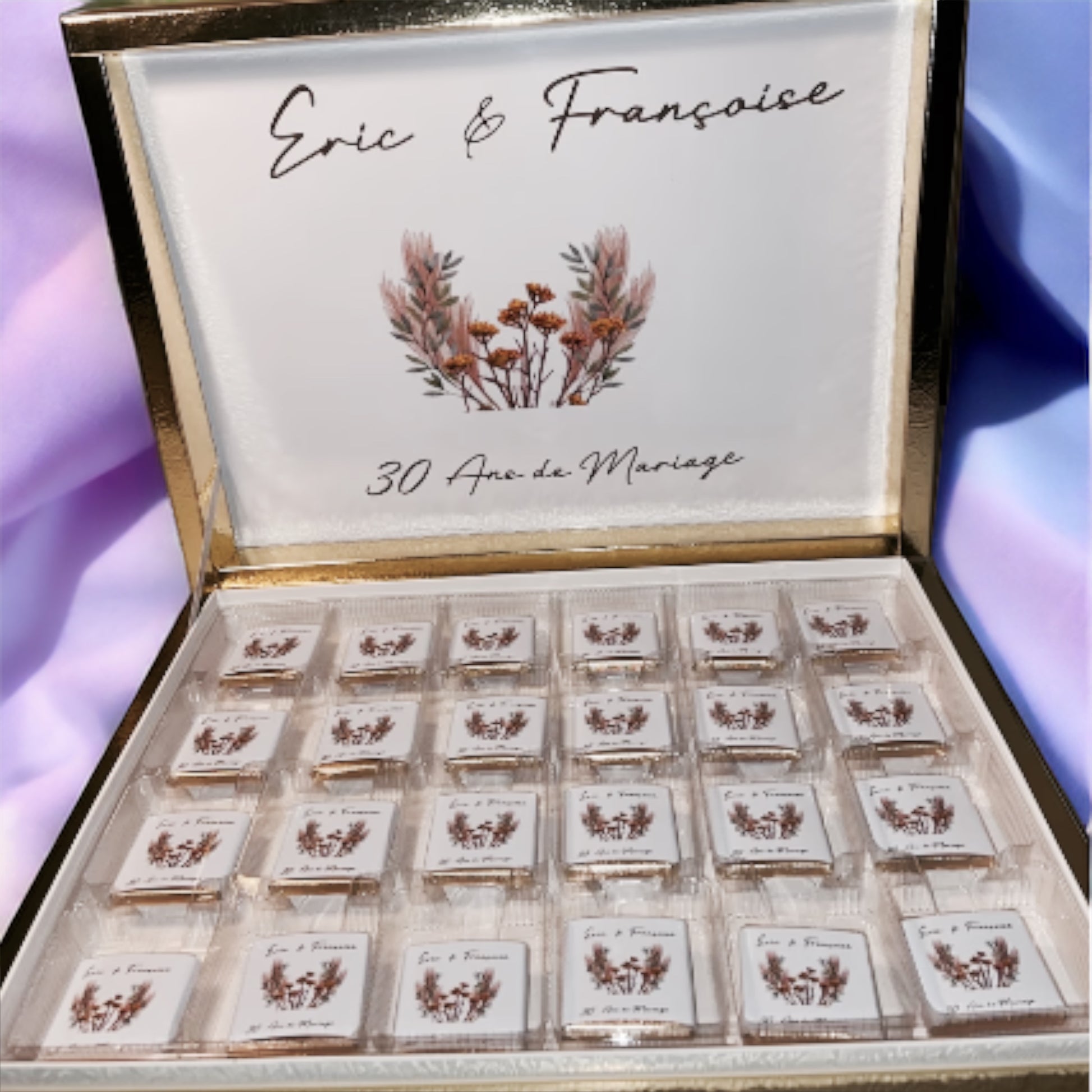 Boite de chocolats personnalisée disponible en doré ou en blanc au choix.