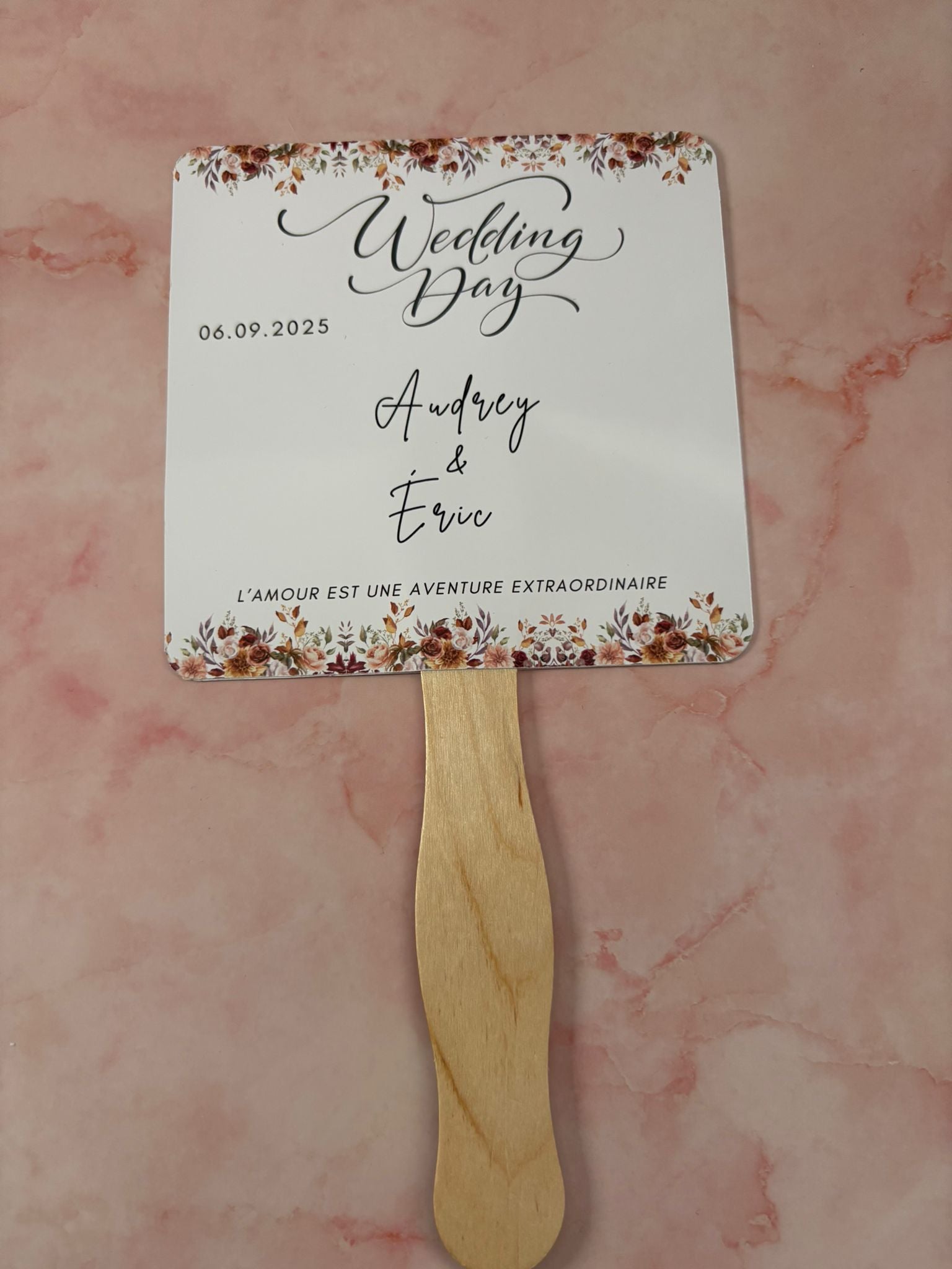 Distribué à l'entrée de l'église, de la mairie ou à placer dans une grande corbeille à la disposition de chacun, les éventails programme donnent le ton de la cérémonie, renseignent vos convives sur le déroulement de la journée et très utiles par grande chaleur.