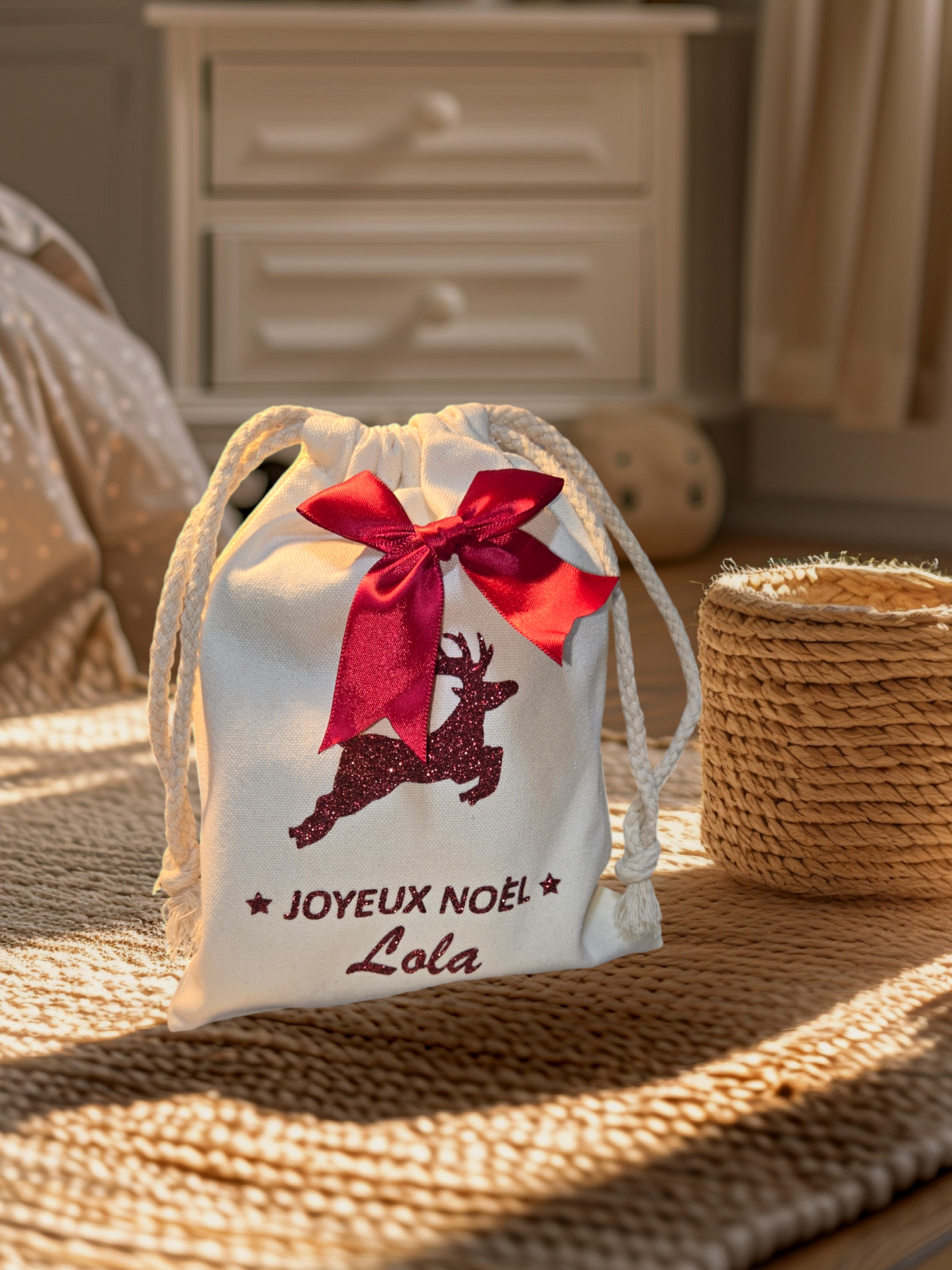 Mini hotte joyeux noël avec nœud rouge et prénom ou avec initiale et prénom